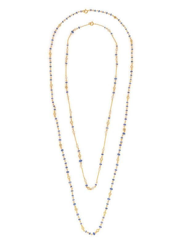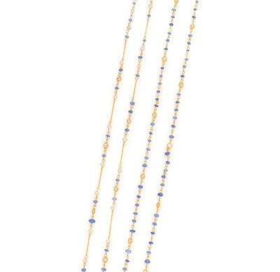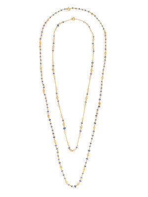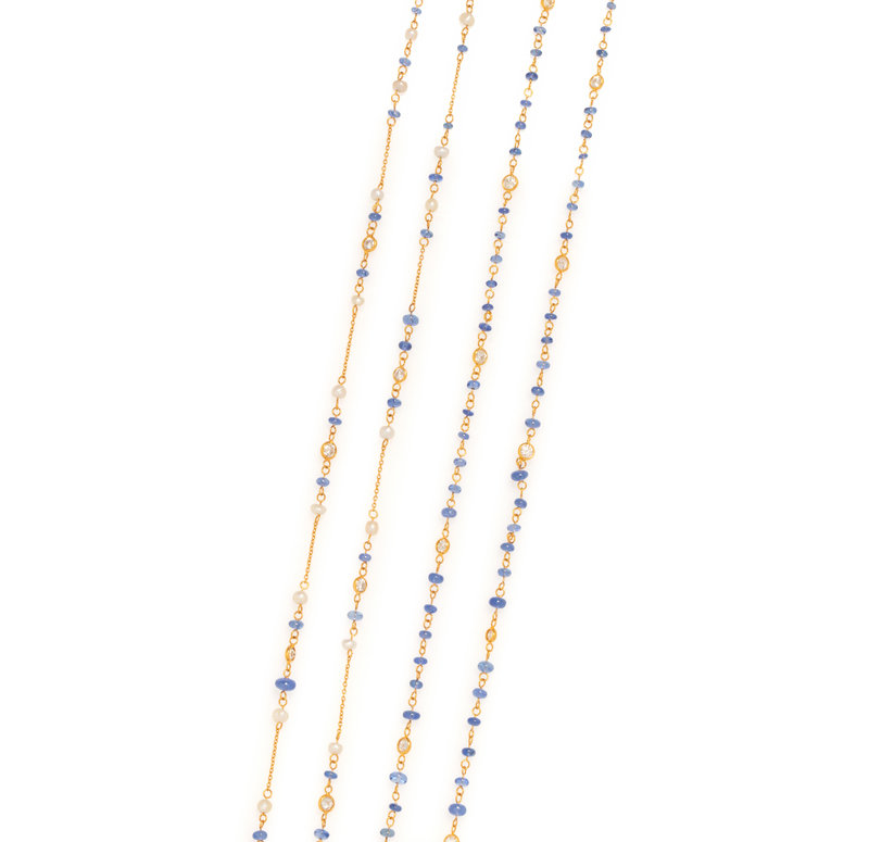Consisting of a necklace containing 17 round brilliant cut diamonds weighing approximately 2.00 carats total and numerous sapphire beads, together with a necklace containing seven round brilliant cut diamonds weighing approximately 0.85 carat total and numerous cultured pearl and sapphire beads. Mounted in yellow gold. 27 1/2 and 19 1/2 inches long.