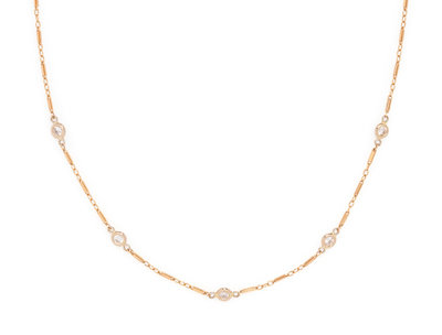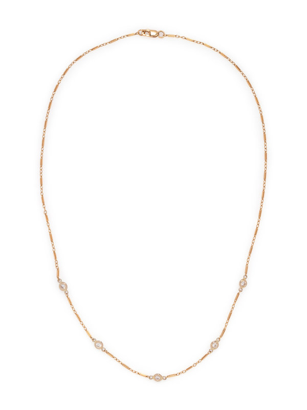 Consisting of a fancy link bar chain interspersed with five round brilliant cut diamonds weighing approximately 0.40 carat total. 17 inches long.