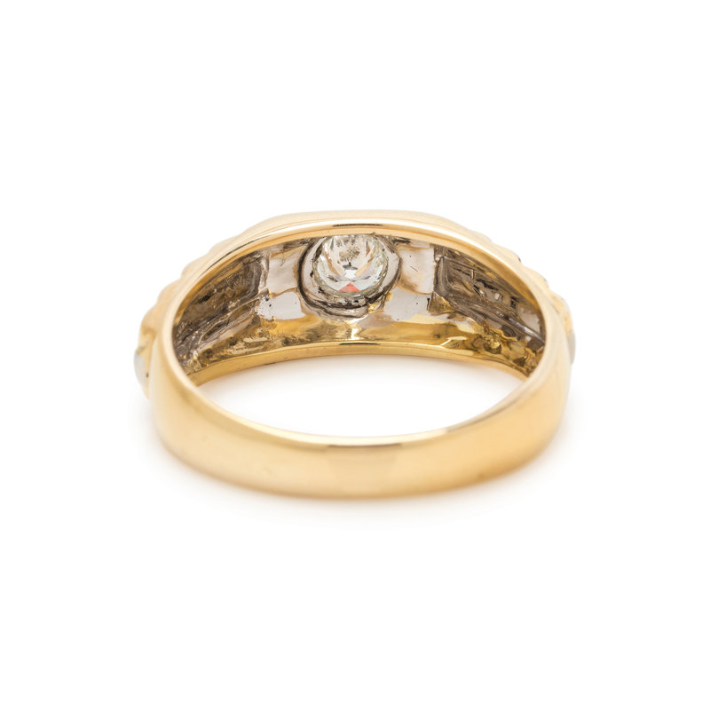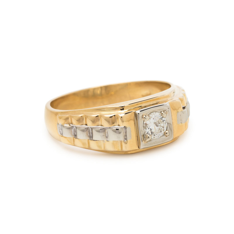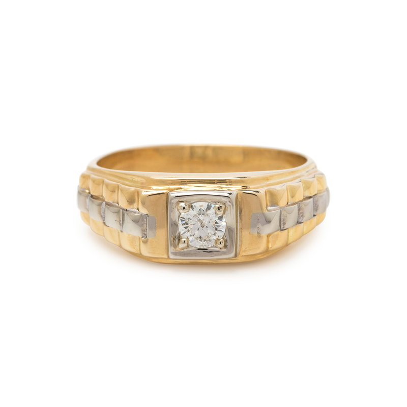 Containing one round brilliant cut diamond weighing approximately 0.30 carat. Mounted in bicolor gold. Ring size 10 1/4.