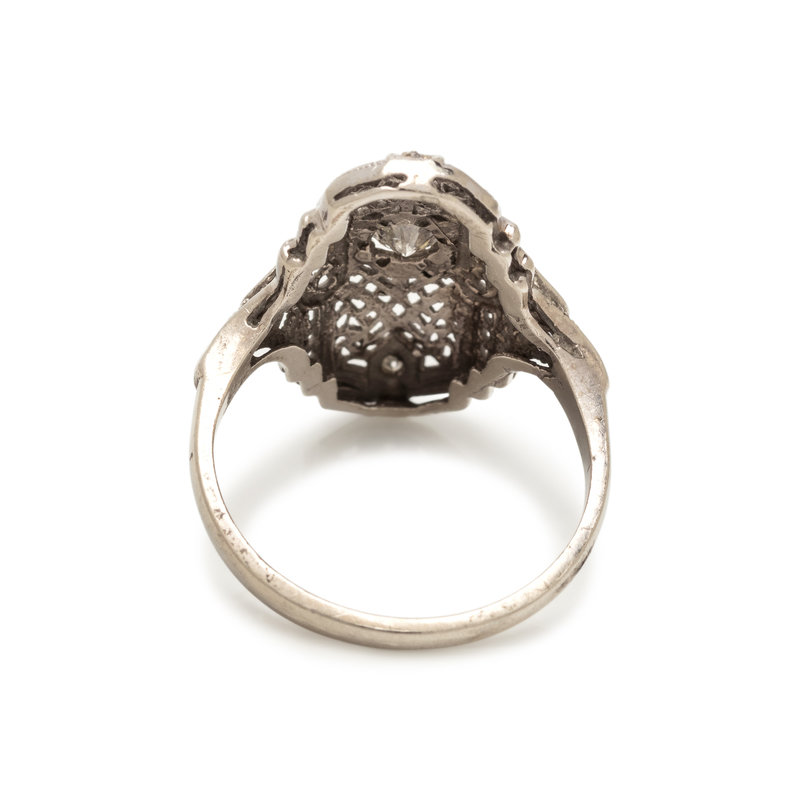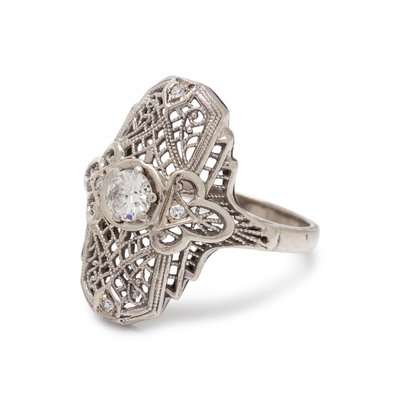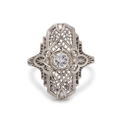 Consisting of a filigree ring containing one round brilliant cut diamond weighing approximately 0.30 carat and two single cut diamonds. Ring size 6 1/2.