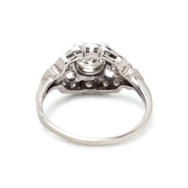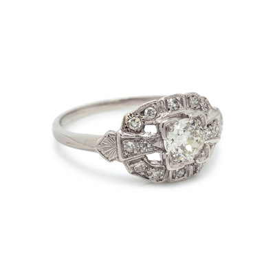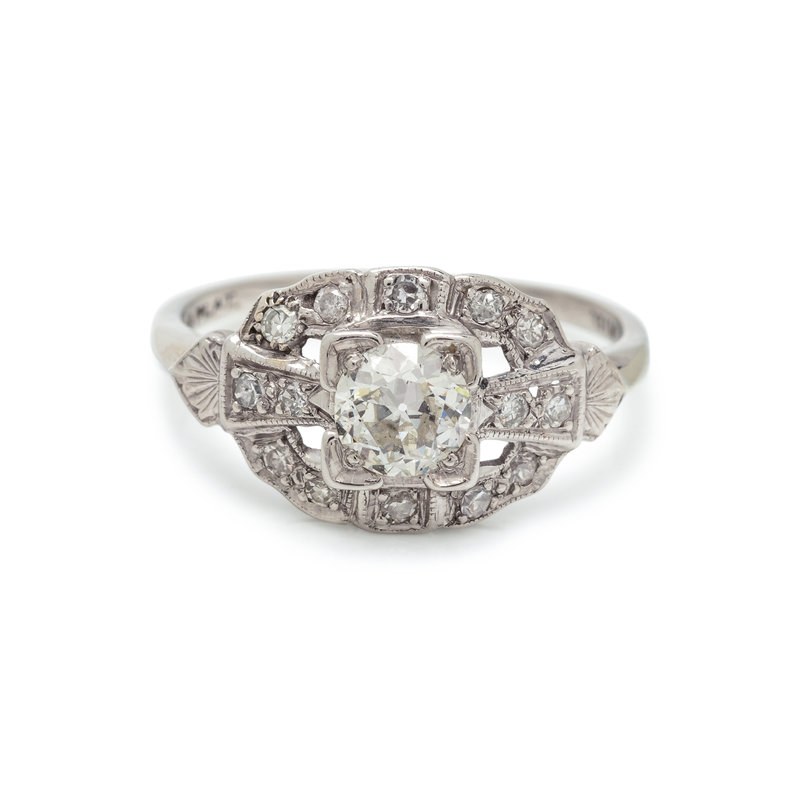 Containing one old European cut diamond weighing approximately 0.45 carat and 14 single cut diamonds. Mounted in platinum. Ring size 5 1/4.