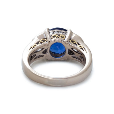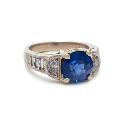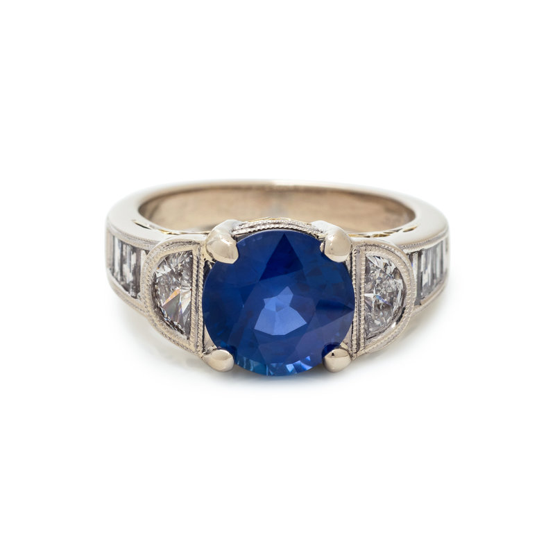 Containing one round mixed cut sapphire measuring approximately 8.50 x 8.55 x 5.75 mm, two half-moon shaped and eight baguette cut diamonds weighing approximately 1.18 carats total. Mounted in white gold. Ring size 5 1/4.