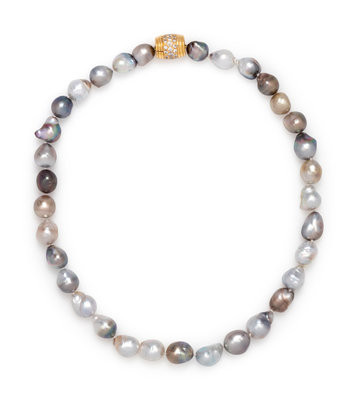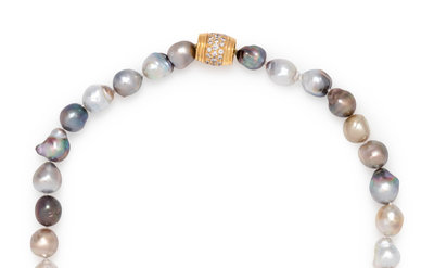 Consisting of Tahitian pearls measuring approximately 9.00-12.00 mm wide, strung knotted with a yellow gold clasp containing 42 round brilliant cut diamonds weighing approximately 1.50 carats total. 17 1/2 inches long.