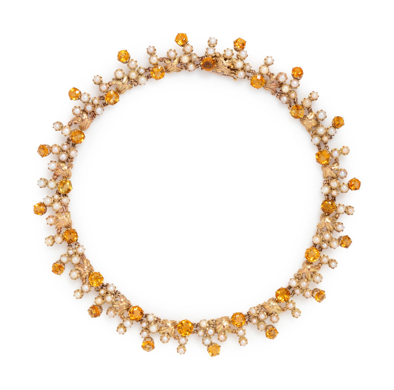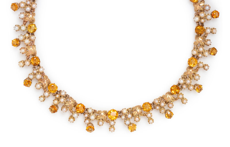 YELLOW GOLD, CITRINE AND CULTURED PEARL NECKLACE