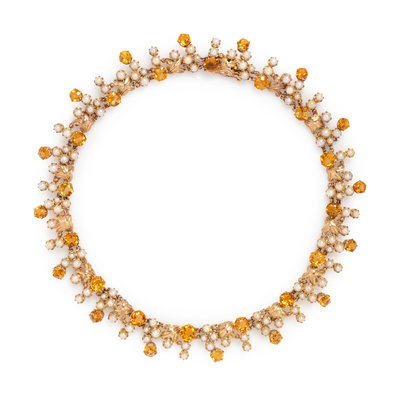 Containing numerous round mixed cut citrines measuring approximately 6.05-7.10 mm in diameter and numerous pearls. 15 1/2 inches inner circumference.