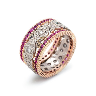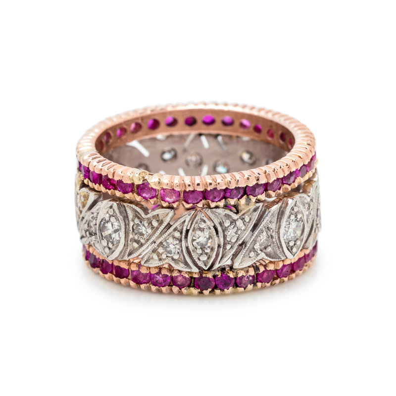 Containing 24 round brilliant and single cut diamonds weighing approximately 0.20 carat total and numerous round mixed cut rubies. Mounted in rose gold and platinum. Ring size 6 1/4.