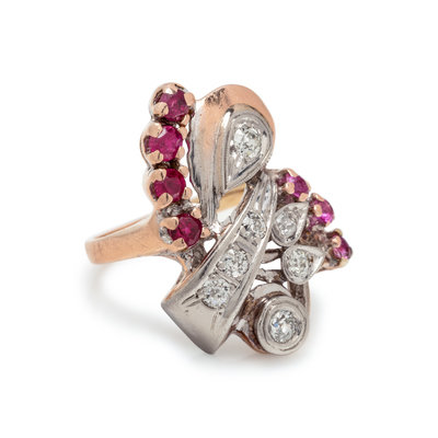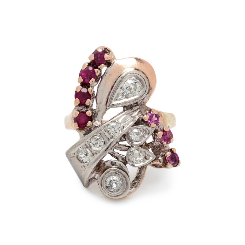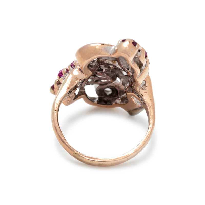 Containing seven old European cut diamonds weighing approximately 0.50 carat total and seven round mixed cut pink sapphires. Mounted in bicolor gold. Ring size 5 3/4.