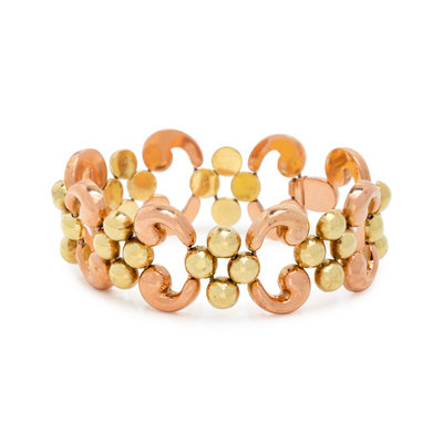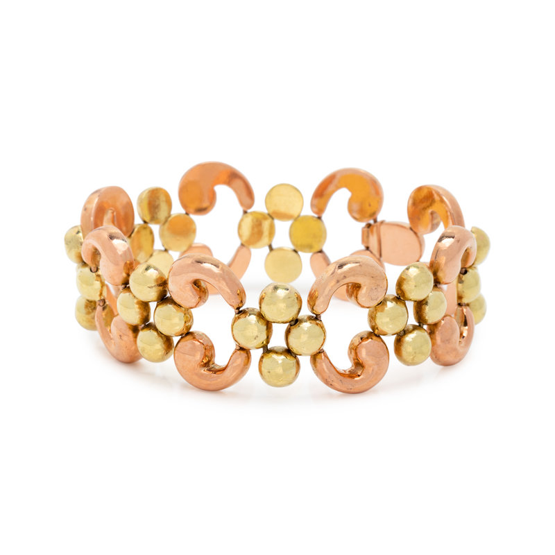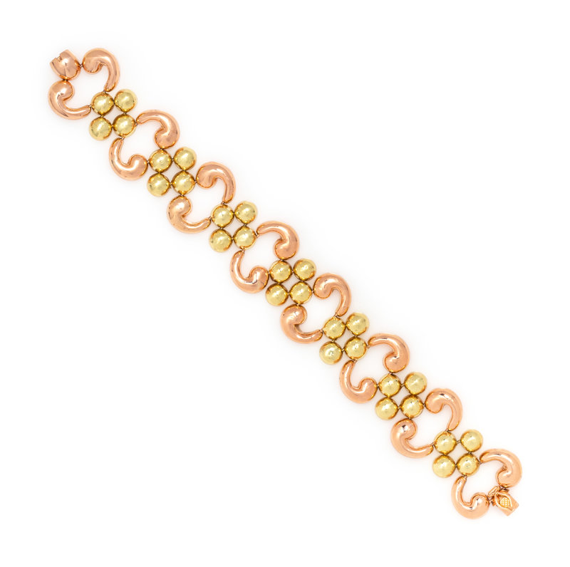 Consisting of yellow and rose gold links measuring approximately 23.00 mm wide. 7 inches long.