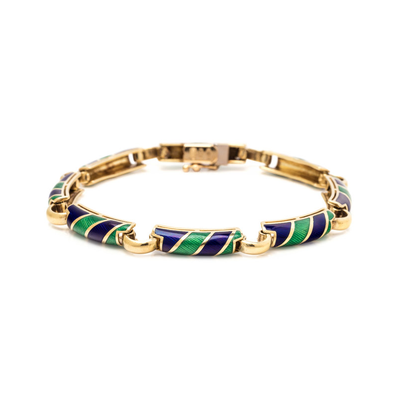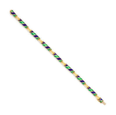 Consisting of bar links with green and blue striped enamel. 7 1/2 inches long.