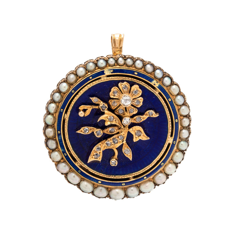 Consisting of a yellow gold flower containing old mine and rose cut diamonds surmounted on a blue enamel movable plaque and pearl surround. Mounted in yellow gold. 1 1/2 inches long.