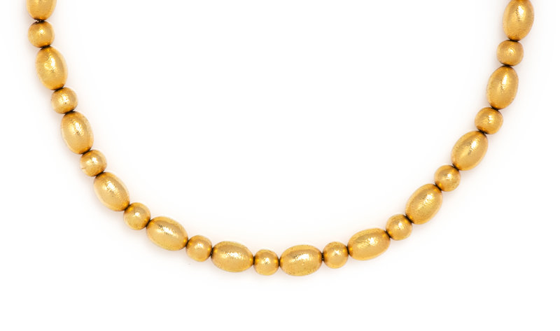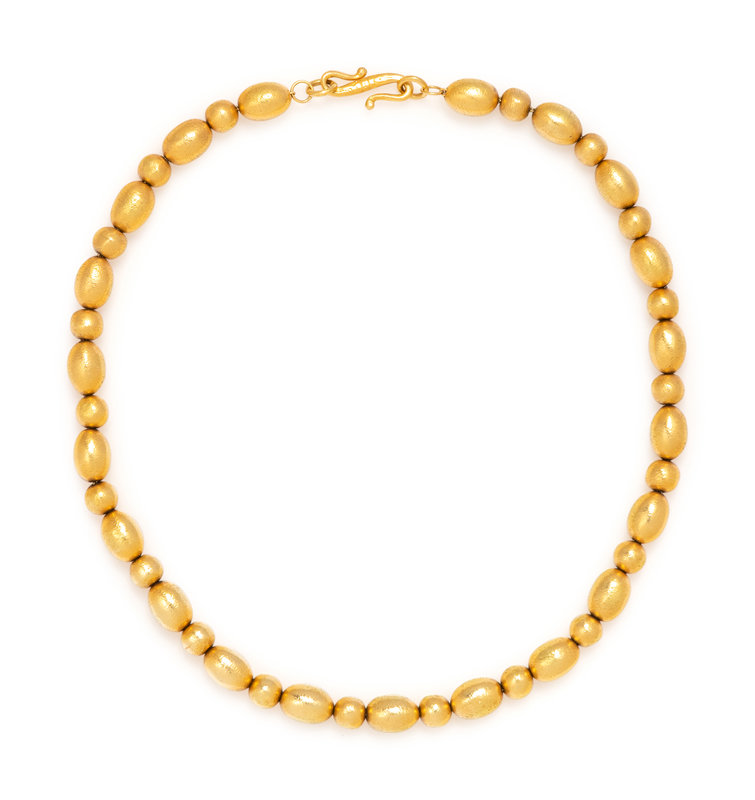 Consisting of alternating round and oval beads with textured finish. 16 3/4 inches long.