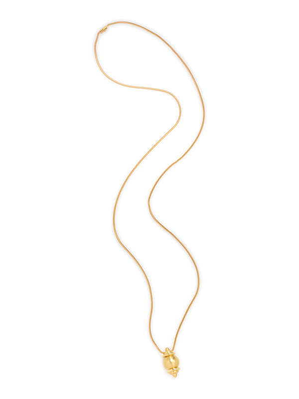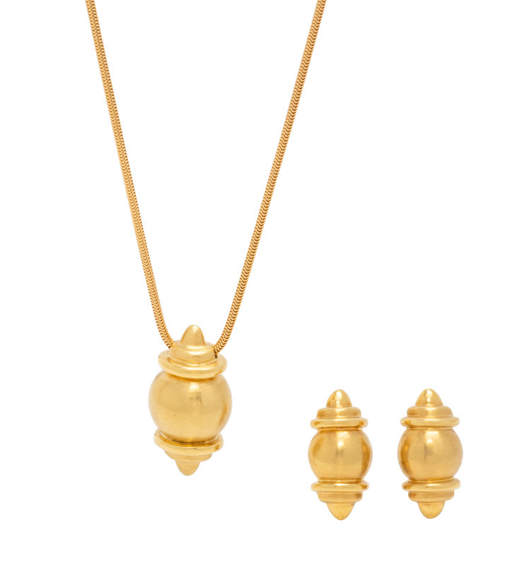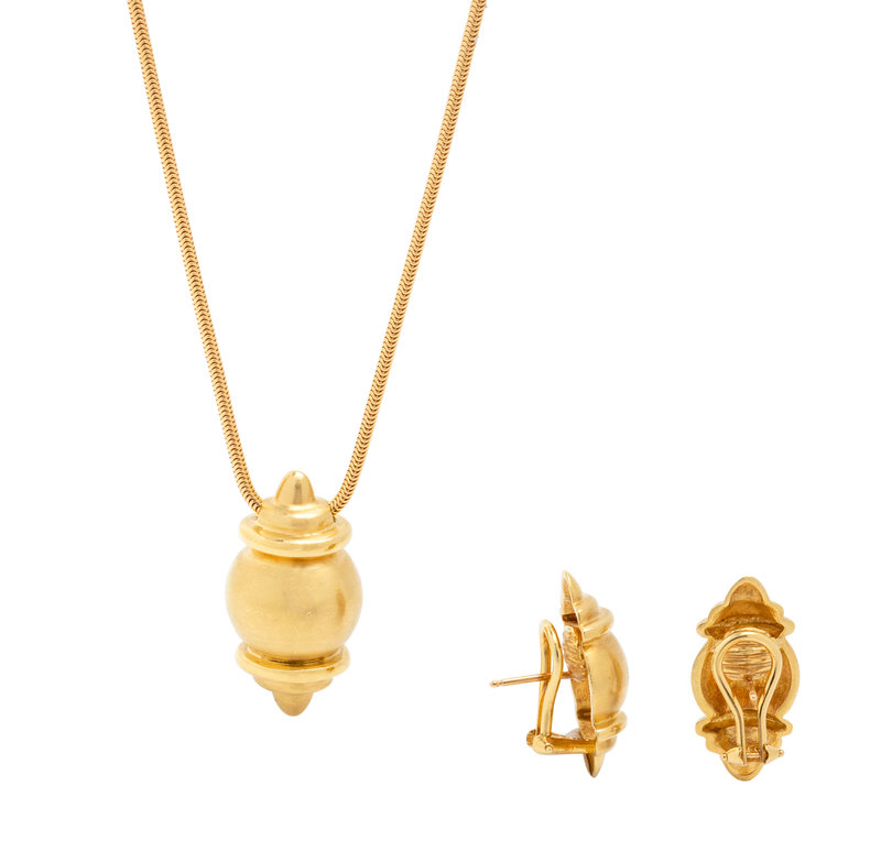 Consisting of a necklace with sculptural pendant suspended from a snake chain, together with a pair of matching earclips, posts with clip backs. Necklace: 34 inches long. Earclips: 1 inch long.