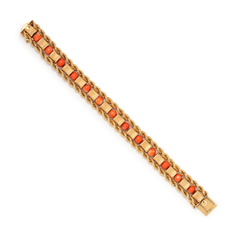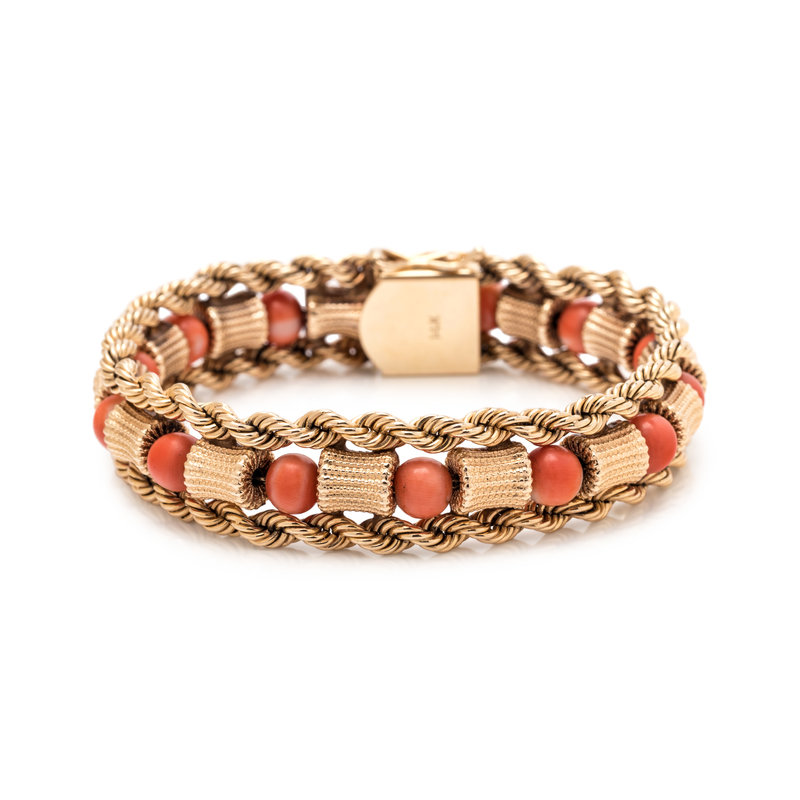 Containing ribbed yellow gold beads alternating with round coral beads edged with rope chains. 7 5/8 inches long.