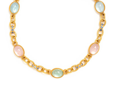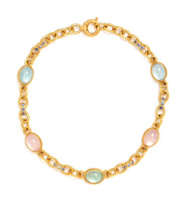 Consisting of a cable link chain interspersed with five mother-of-pearl backed oval aquamarines and rose quartz cabochons and six connector links containing 18 round mixed cut sapphires. 16 inches long.