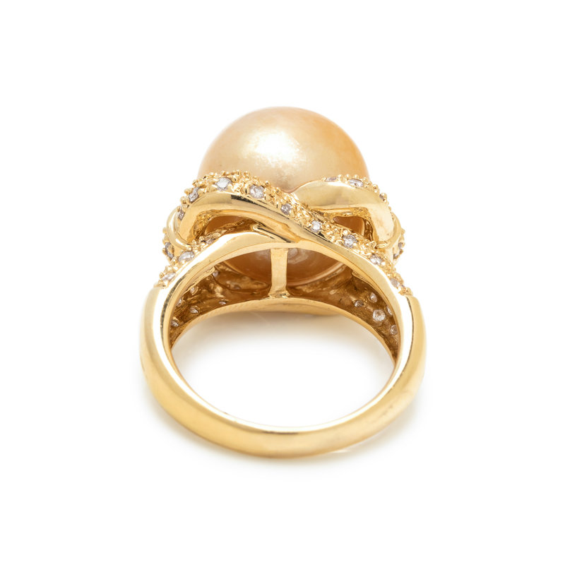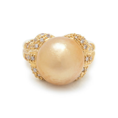 Containing one golden South Sea pearl measuring approximately 14.00 mm in diameter and 60 round brilliant cut diamonds weighing approximately 0.50 carat total. Mounted in yellow gold. Ring size 7.