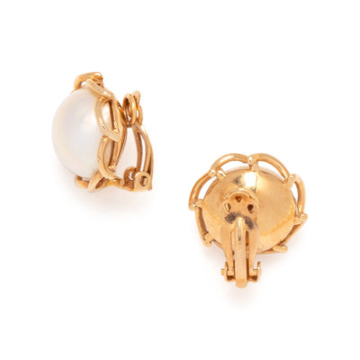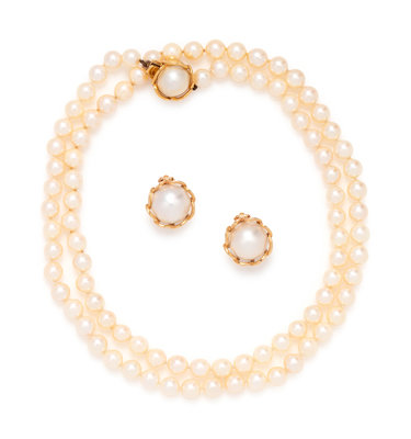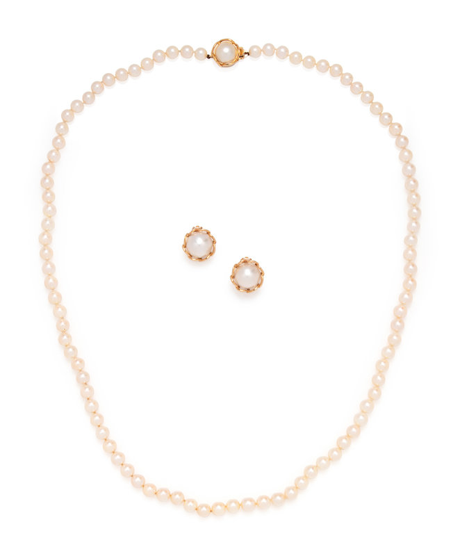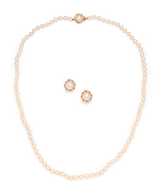 Consisting of a necklace containing pearls measuring approximately 7.85 mm in diameter, strung knotted with a mabe pearl and yellow gold clasp, together with a pair of matching mabe pearl and yellow gold earclips. Necklace: 30 1/2 inches long. Earclips: 3/4 inch wide.