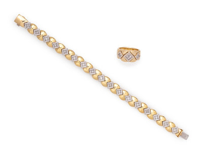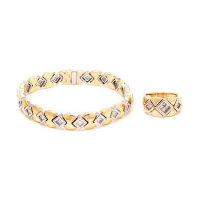 Consisting of a bracelet containing 17 princess cut diamonds weighing approximately 1.70 carats total, together with a ring containing six princess cut diamonds weighing approximately 0.40 carat total. Bracelet: 7 1/4 inches long. Ring size 6 3/4.