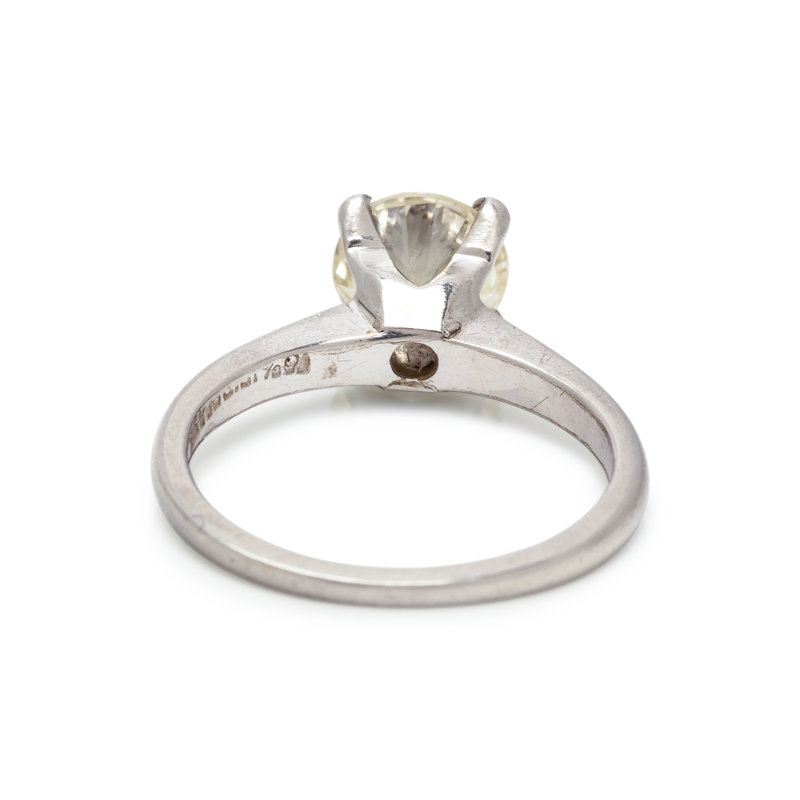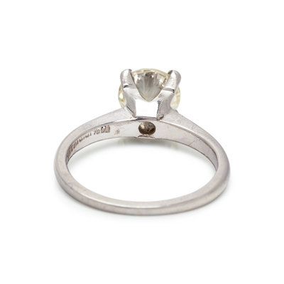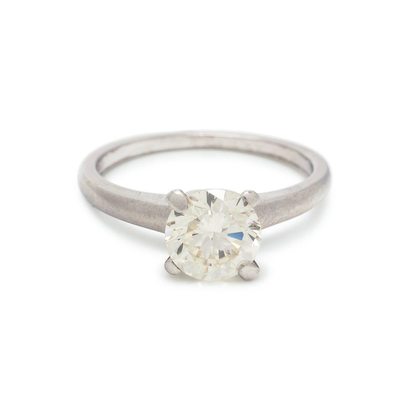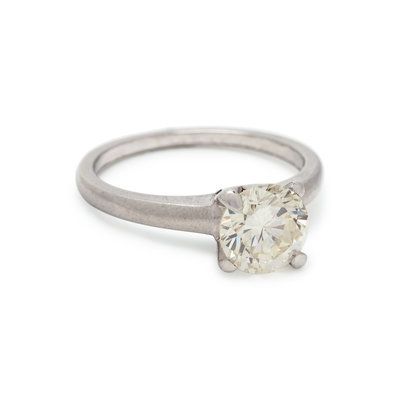 Containing one round brilliant cut diamond weighing approximately 1.30 carats. Mounted in platinum. Ring size 5 1/2.