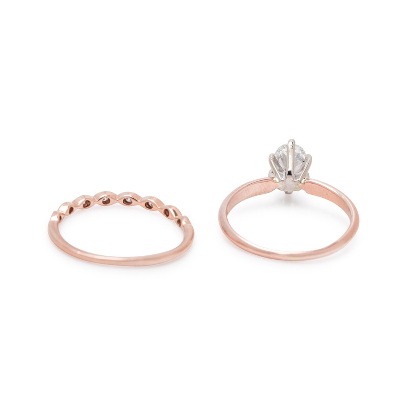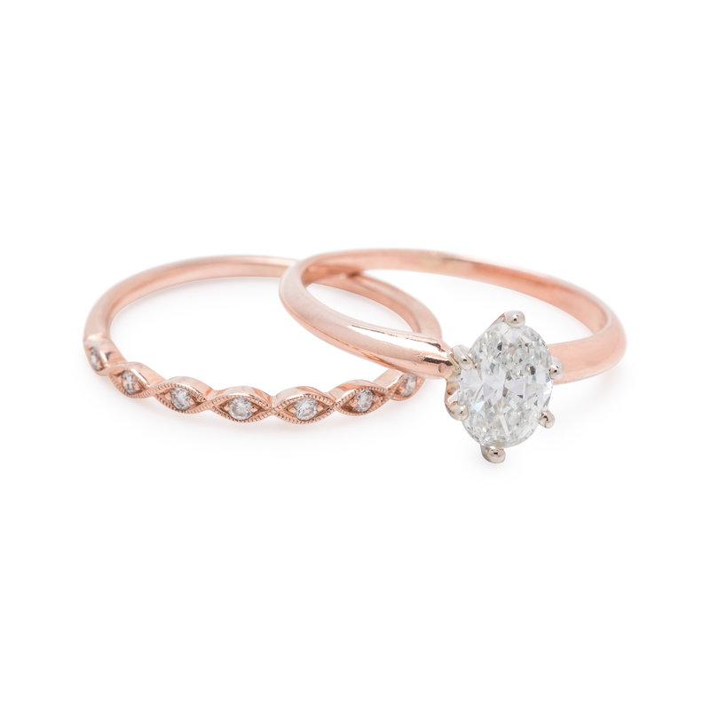 Consisting of a ring containing one oval brilliant cut diamond weighing approximately 0.70 carat, together with a band containing eight round brilliant cut diamonds. Mounted in rose gold. Ring sizes 6 3/4 and 7.