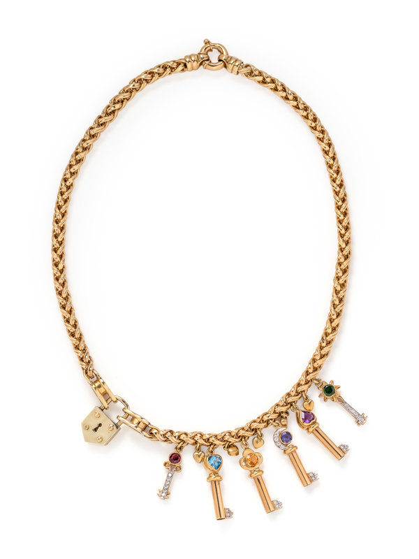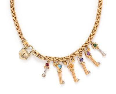 Consisting of a wheat chain with integrated lock link suspending six gemstone and diamond key charms. 17 1/2 inches long.