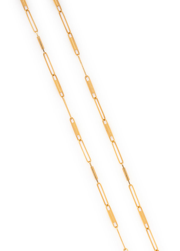 Consisting of a fancy link chain with high polish and textured finish. 36 inches long.