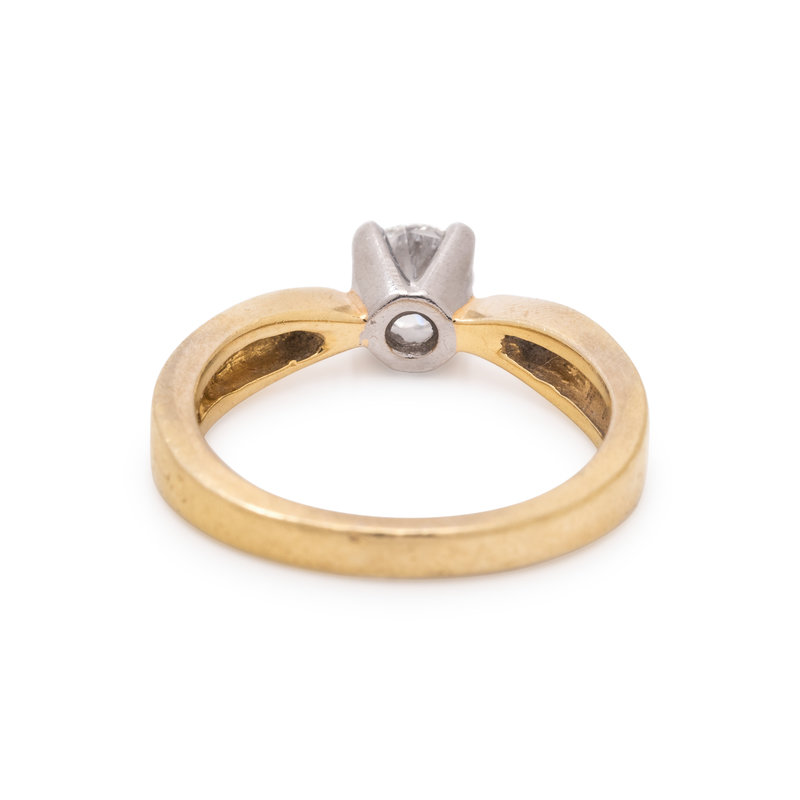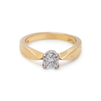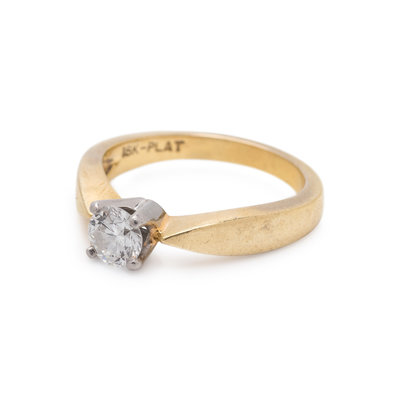 Containing one round brilliant cut diamond weighing approximately 0.45 carat. Mounted in yellow gold and platinum. Ring size 6 1/4.