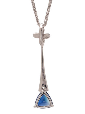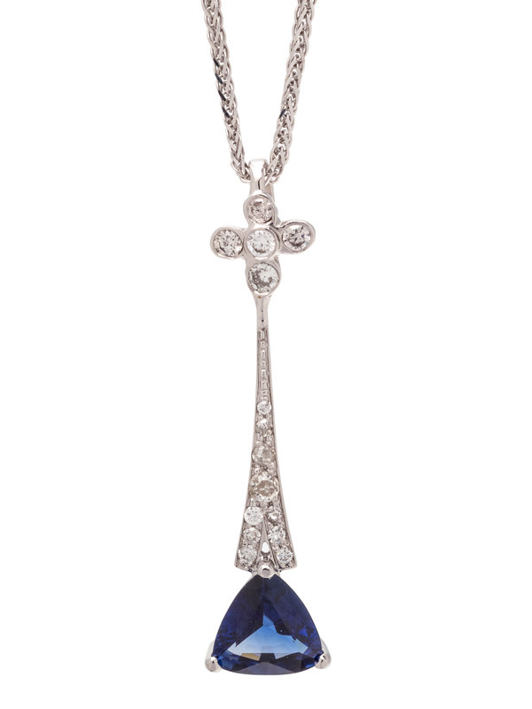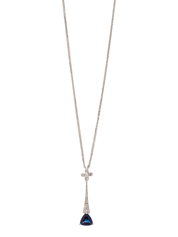 Consisting of a pendant containing one triangular mixed cut sapphire measuring approximately 7.50 x 7.55 x 3.50 mm and 15 single, round brilliant and old European cut diamonds, suspended from a faceted foxtail chain. Mounted in white gold. 20 inches long.