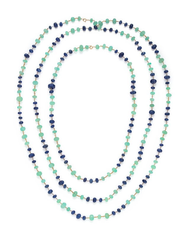Consisting of a longchain necklace and shorter necklace containing numerous fluted emerald and sapphire beads measuring approximately 5.00-10.00 mm wide. Mounted in yellow gold. 60 inches and 21 inches long.