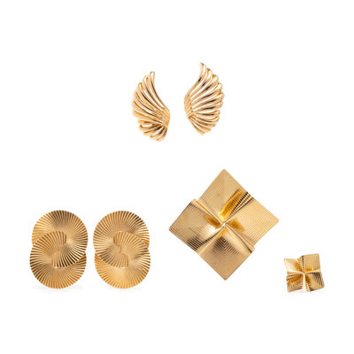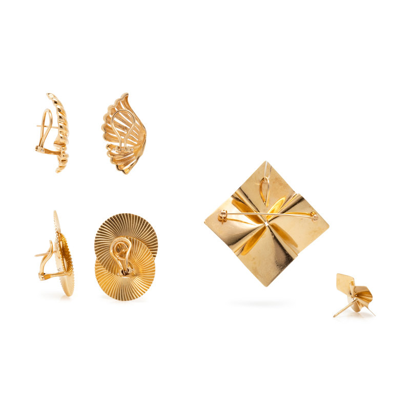 Consisting of a pair of ridged interlocking circle earclips, posts with clip backs, a pair of curled design earclips, posts with clip backs, a folding square pendant/brooch, together with a matching single stud earring. Circle earclips: 1 5/16 inches long. Curling earclips: 1 3/16 inches long. Pendant/brooch: 1 7/8 x 1 7/8 inches. Earring: 5/8 inch long.