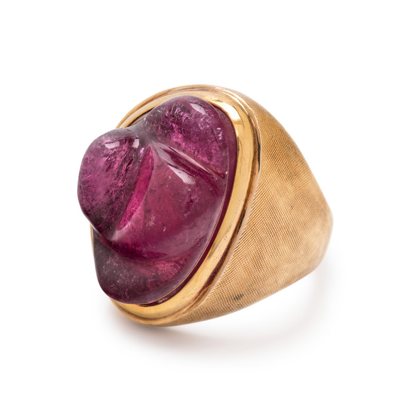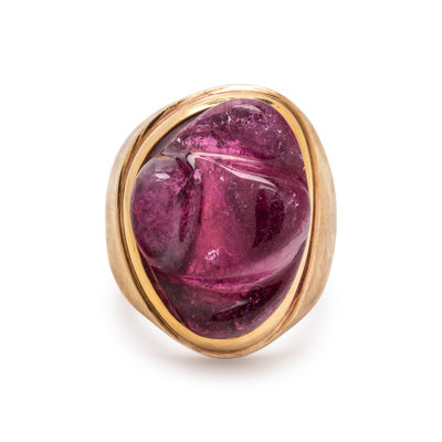 Containing one freeform carved pink tourmaline measuring approximately 19.00 x 14.15 mm. Ring size 5 1/4.