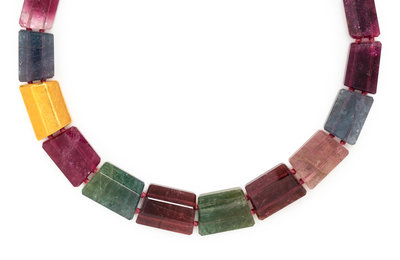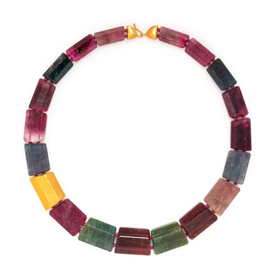 Containing 18 tourmaline beads of various colors, with one hammered high karat gold bead and clasp. 16 3/4 inches inner circumference.