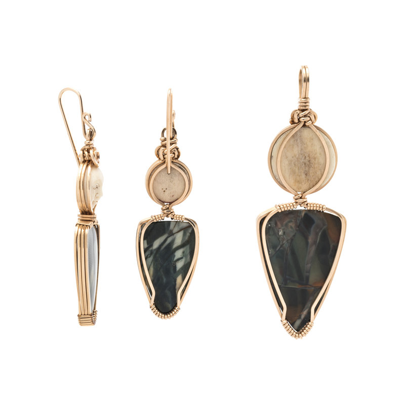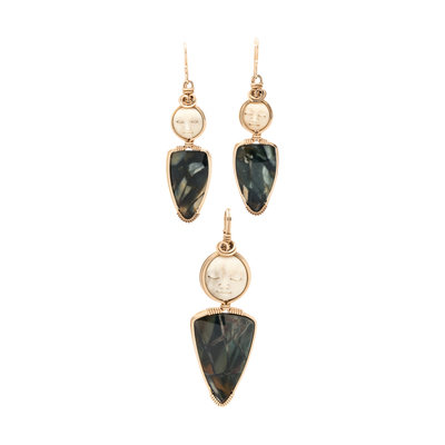 Consisting of a pendant and a pair of matching earrings containing carved white faces and triangular hardstone plaques, set in yellow gold wirework. Pendant: 2 1/2 inches long. Earrings: 2 1/4 inches long.