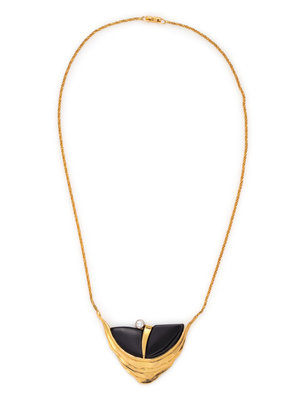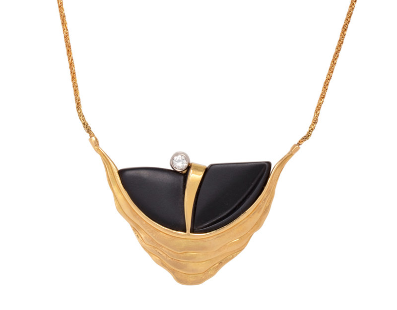 Consisting of an organic yellow gold central section containing one black plaque and one round brilliant cut diamond weighing approximately 0.15 carat, suspended from a fancy link chain. 16 inches long.