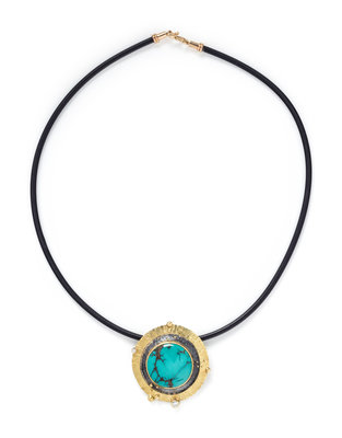 Consisting of a textured yellow gold and silver pendant containing one oval cabochon turquoise measuring approximately 21.85 mm in diameter and two round brilliant cut diamonds weighing approximately 0.15 carat total, suspended from a black cord with yellow gold clasp. 17 3/4 inches long.