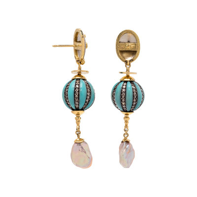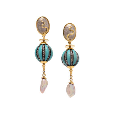Consisting of a textured palladium top suspending round links with blue enamel and numerous single cut diamonds and two keshi pearl drops. Mounted in yellow gold and silver. 2 3/8 inches long.