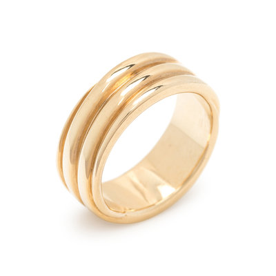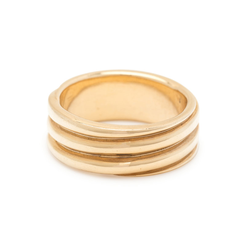 Consisting of a twisting ridged design measuring approximately 7.00 mm wide. Ring size 6.