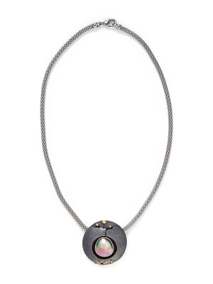 Consisting of a textured sterling silver pendant with yellow gold accents containing one mabe pearl measuring approximately 15.30 x 14.10 mm, suspended from a steel popcorn link chain. 17 3/4 inches long.