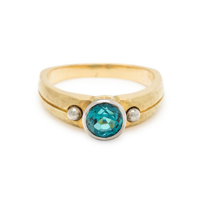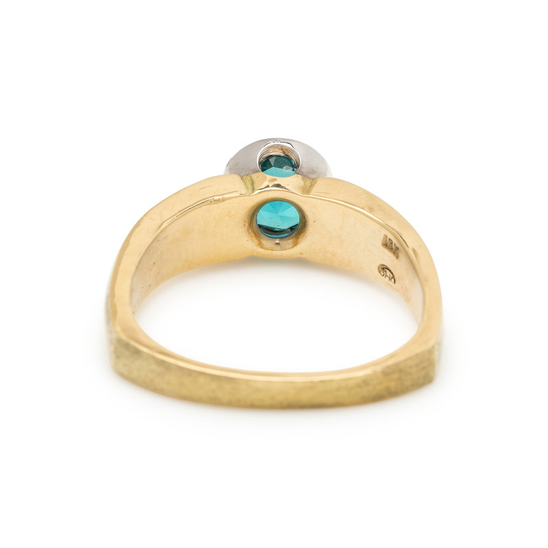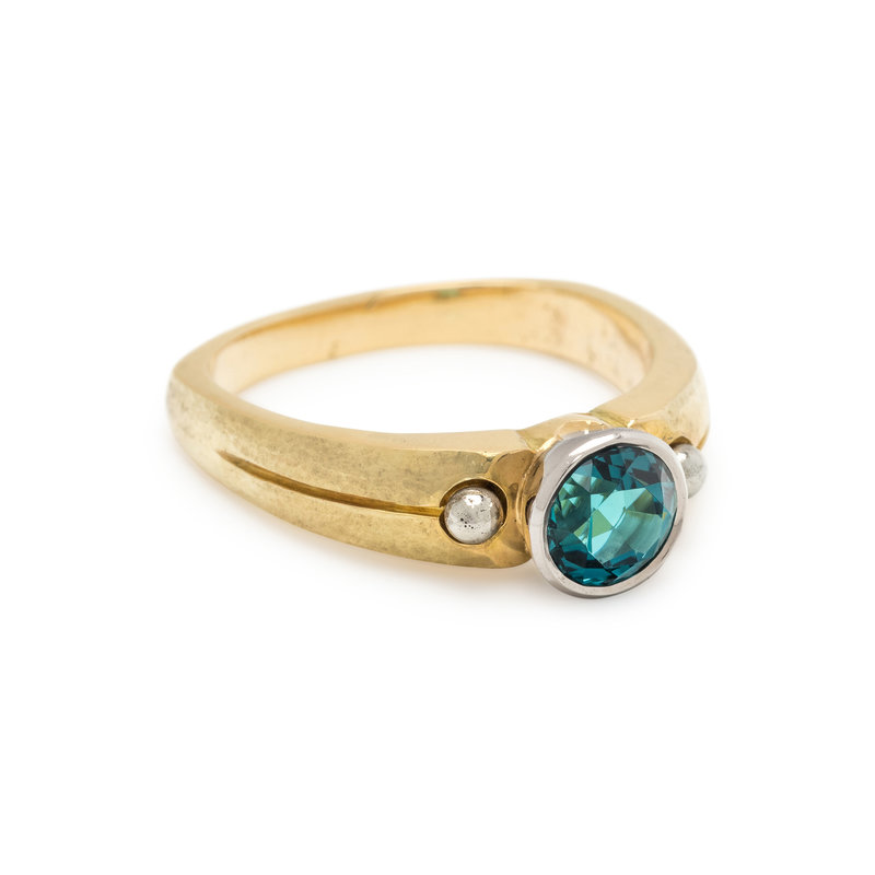Containing one round mixed cut blue tourmaline measuring approximately 5.50 mm in diameter. Mounted in yellow gold and palladium. Ring size 5 1/2.
