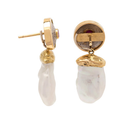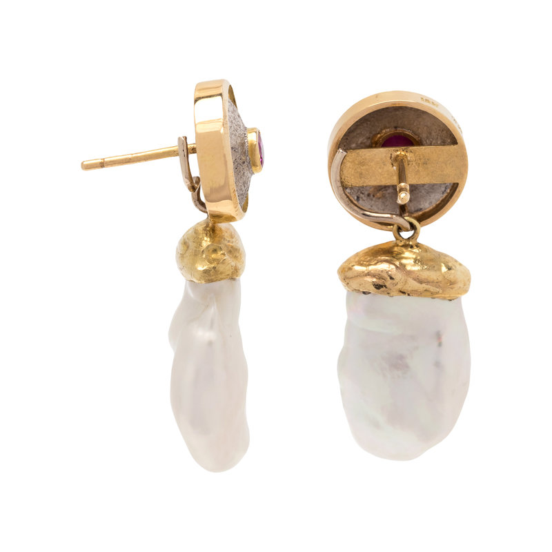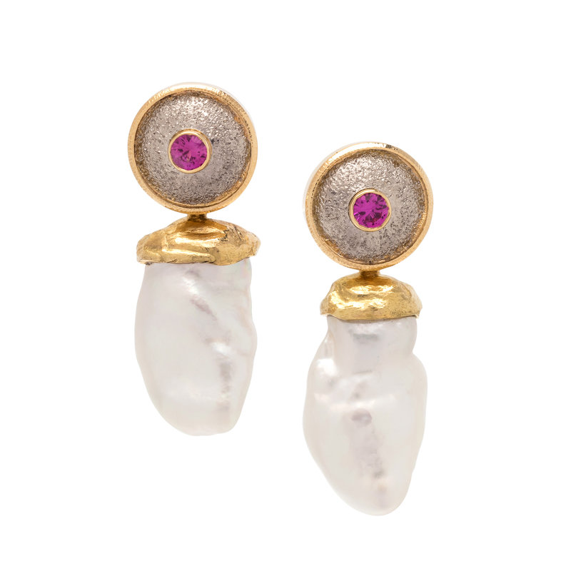 Consisting of earrings containing two round mixed cut pink sapphires with removable Baroque pearl drops. Mounted in palladium and yellow gold. 1 1/4 inches long.