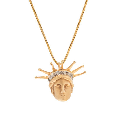 Consisting of a Statue of Liberty pendant containing seven single cut diamonds, suspended from a box link chain. 16 inches long.