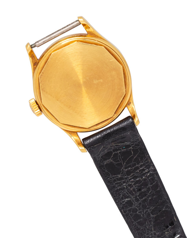 31.00 mm case diameter, matte silvered dial, applied gold baton numerals, subdial for seconds at 6 o'clock, manual wind movement, one side of black leather strap with yellow gold tang buckle signed Patek Philippe.