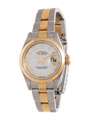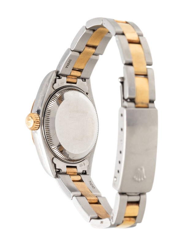 25.00 mm case diameter, mother-of-pearl gold dial, applied gold Roman numerals, date aperture at 3 o'clock with magnifier in crystal, self-winding movement, stainless steel and yellow gold Jubilee link bracelet, deployant clasp with Rolex logo. 5 3/4 inches inner circumference.