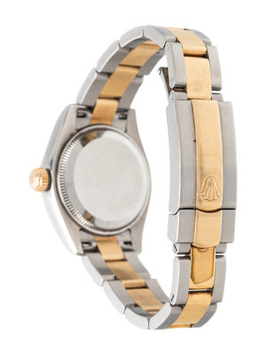 25.00 mm case diameter, dimpled matte gold dial, applied single cut diamond numerals, date aperture at 3 o'clock with magnifier in crystal, self-winding movement, stainless steel and yellow gold Jubilee link bracelet, deployant clasp with Rolex logo. 6 1/4 inches inner circumference.