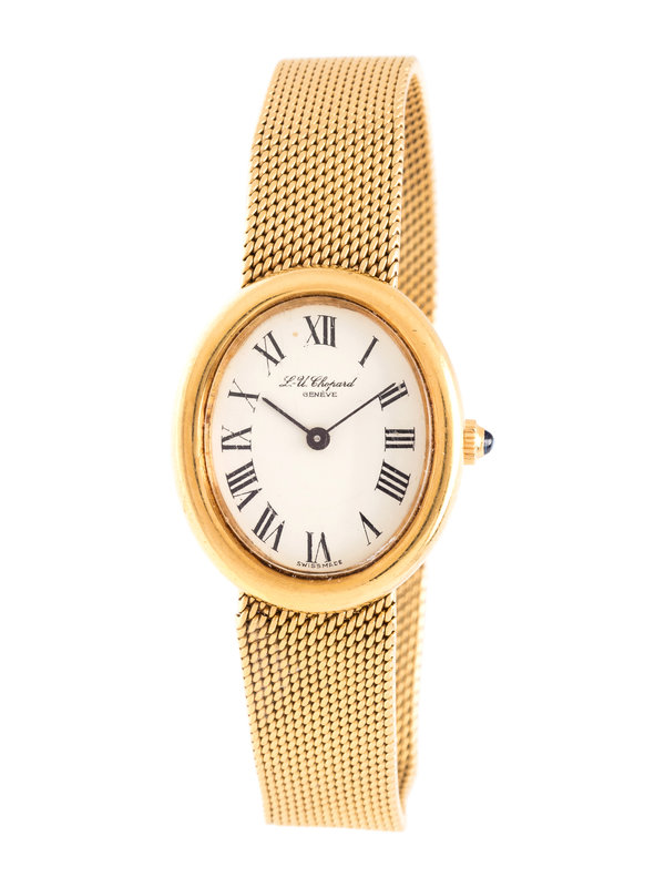 26.00 x 22.00 mm case dimensions, white dial, black Roman numerals, 17 jewel manual wind movement signed L.U.CHOPARD & CIE GENEVE SWISS, integrated mesh link bracelet, fold over clasp. 6 1/8-6 1/4 inches long.