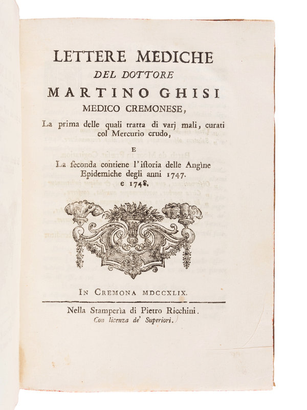 GHISI, Martino (1715-1794). Lettere Mediche. Cremona: Pietro Ricchini, 1749.