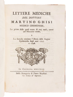 Ghisi, a physician in Cremona, Italy, studies under Paolo Valcarenghis before moving to Florence. He returned to Cremona to practice medicine, and in 1747-1748, he combatted an epidemic which struck a large number of children and adolescents in the Cremona region. He made careful clinical and meteorological observations on the epidemic, which he published in the present pamphlet Lettre mediche del Dottor M. Ghisi. The second section of the work presents the first complete scientific description of diphtheria. RARE: We trace no copy of either work ever sold at auction.