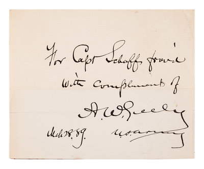 FIRST EDITION, PRESENTATION COPY, WITH AUTOGRAPH NOTE SIGNED laid-in: "For Capt. Schaff['s friend?] with compliments of A. W. Greely U. S. Army Mch. 28, '89." The official report of Greely's ill-fated expedition to explore the northwest coast of Greenland, during which most of the party would perish before the could be rescued in 1884.