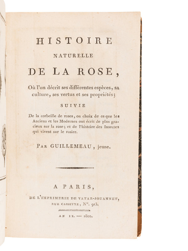 GUILLEMEAU, Jeune (“Jean Louis Marie”) (1766-1850). Histoire Naturelle de la Rose, où l'on décrit ses différentes espèces, sa culture, ses vertus et ses propriétés; suivie de la corbeille des rose, ou choix de ce que les Anciens et les Modernes ont écrit de plus gracieux sur la rose; et de l'histoire des Insectes qui vivent sur le rosier. Paris: Vatar-Jouannet, 1800.