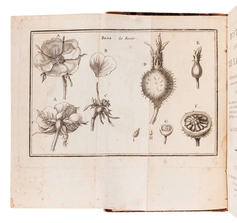 FIRST EDITION of French physician and naturalist Guillemeau's work about roses. The 5 sections include: an introduction with discussion of types and varieties; an analytical table based on Lamarck’s classification; an examination of cultivation of numerous varieties; insects affecting roses; literary lore, poetry, and prose featuring roses; medicinal uses of roses; and recipes for rosewater, oils, vinegars, and syrups. Johnston 660; Pritzel 3643; Stock 1102; not in Nissen.