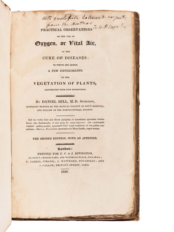 HILL, Daniel M.D. Practical Observations on the use of Oxygen, or Vital Air, in the Cure of Diseases: to which are added a few experiments on the Vegetation of Plants. London: for F. C. & J. Rivington, 1820.